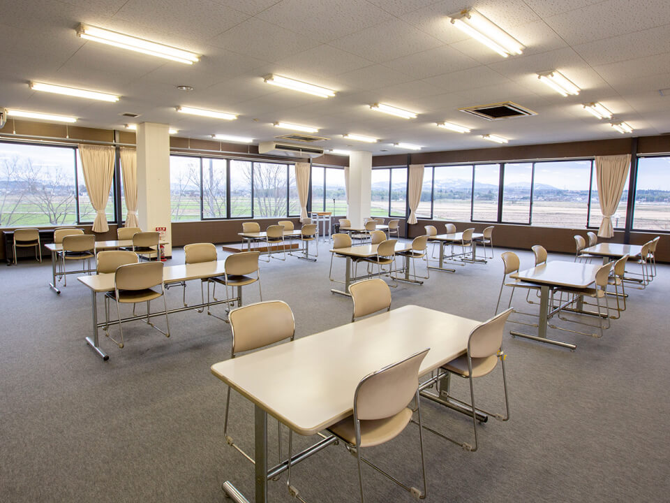 全社員が座わることができる広い空間です。テレビを見ながら、みんなが団らんすることができます。2階で窓が多いことから、天気の良い日は立山連峰を含む広大な景色を楽しむこともできます。